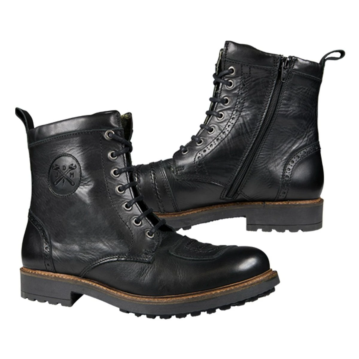 All of our motorcycle shoes of course also have a “waterstop function” (like trekking and hiking shoes), i.e. The tongue is designed to prevent water from quickly seeping into the boot at the laces. The “easy entry” to the boot via zipper allows the rider to quickly and easily put the boot on and take it off without unlacing for added comfort. An oil-resistant, vibration absorbing non-slip sole is also standard on our john doe motorcycle boots. The beautiful vintage leather and details such as a john doe logo embossed in leather on the ankle protection and the JDM metal emblem on the tab round off the classic design of our “falcon”.